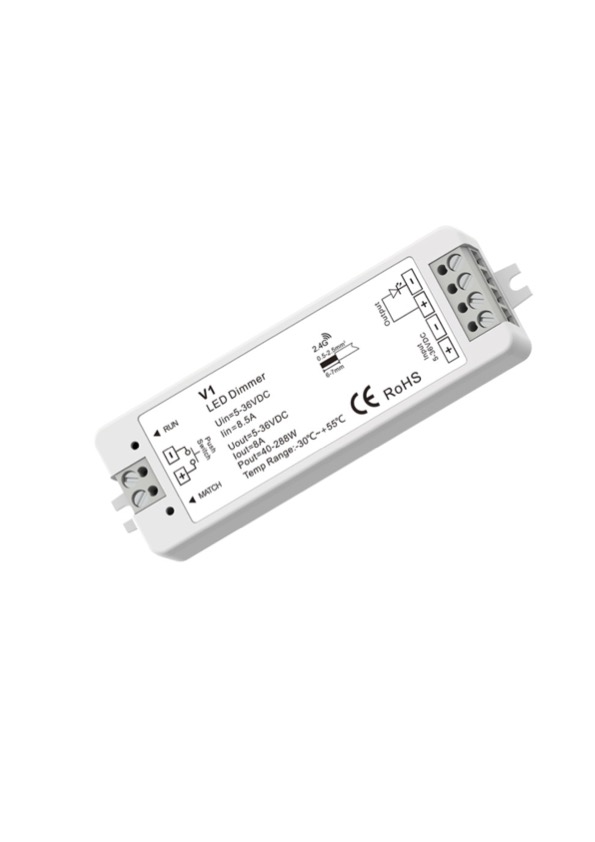 Mini LED controller met 4 kanalen, passend op alle N-schakelaars en afstandsbedieningen. Draadloos gestuurd, kan gekoppeld worden tot 10 schakelaars of afstandsbedieningen. Output bij onze 12V/24V LED strips bedraagt 192W (bij 12V 96W).