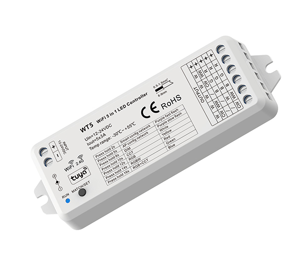 Alles simpel en snel bestuurd, dankzij de WT5. Compatibel met Amazon Alexa en Google Assistant. Te gebruiken met afstandsbediening en smartphone. Voor rgb, rgbw,rgb+cct en dimbaar. Te gebruiken met 2,4 Ghz wifi band Tuya App beschikbaar voor je smartphone. Afmetingen 114 mm breed, 38 mm diep en 20 mm hoog.